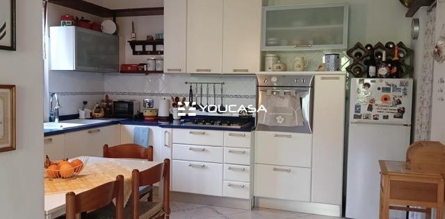 Il piano terra della casa accoglie con un luminoso open space composto da soggiorno e cucina a vista, un comodo ripostiglio, una camera da letto matrimoniale e un bagno finestrato completo sia di vasca che di doccia.